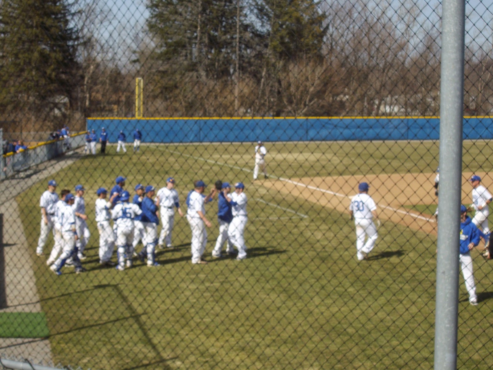 The Madonna University Crusaders celebrated the 11-5 victory in the second game of the double header. |